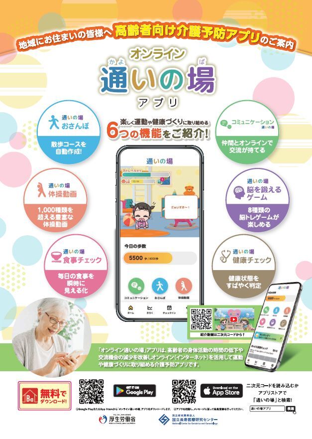 厚生労働省と国立研究開発法人国立長寿医療研究センターが共同で開発した介護予防アプリ「オンライン通いの場アプリ」がリリースされています。