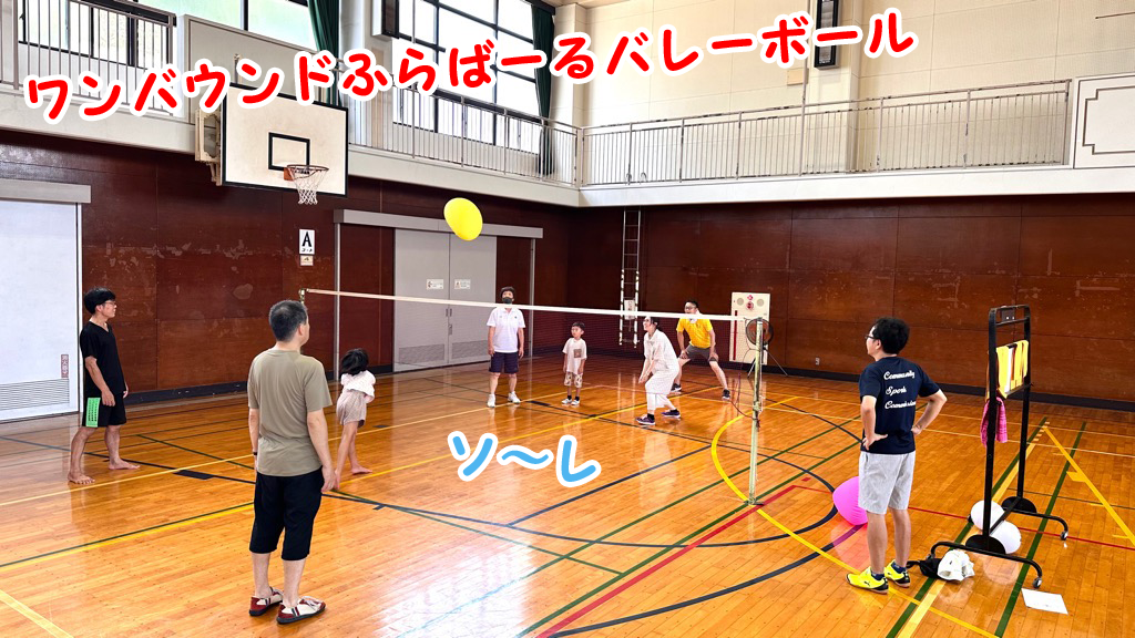 - ワンバウンドふらば~るバレーボール(2つのチームが一定のコート上でネット越しに変形ボール(ふらば~る)を打ち合う、バレーボール型のスポーツ)