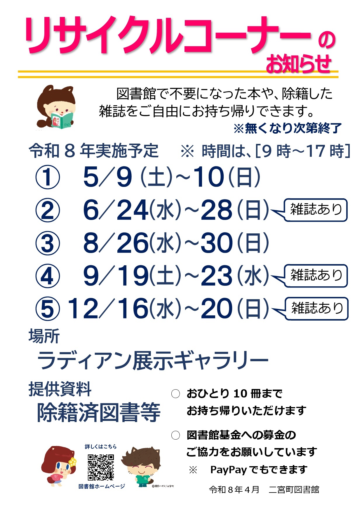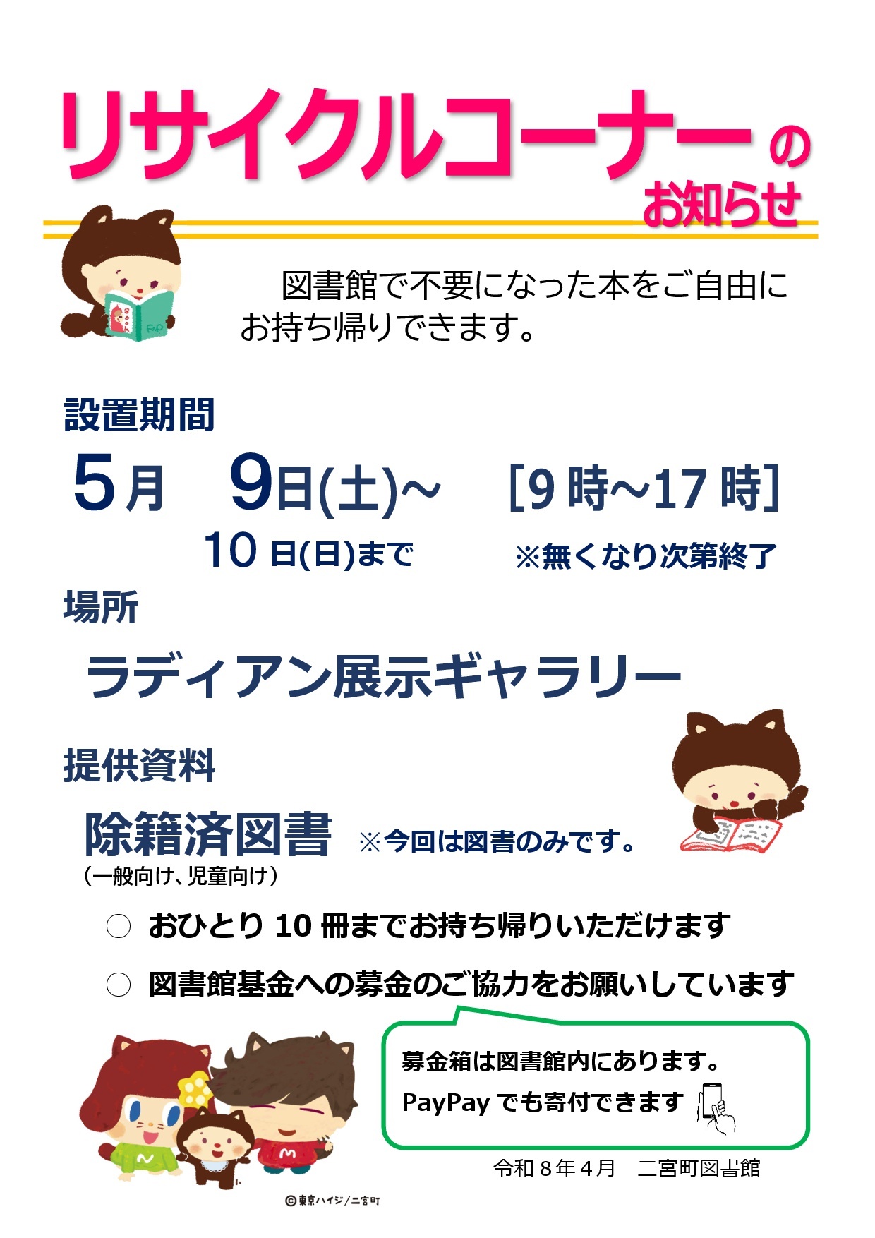 ★図書館基金への募金のご協力をお願いしています。 ・募金箱は図書館内にあります(図書館1F新聞コーナー脇)。 ・PayPayでも募金できます(図書館1Fカウンター)。