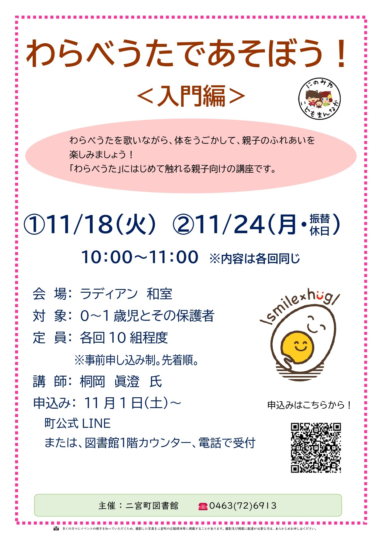 「わらべうた」に初めて触れる親子向け講座を開催します。