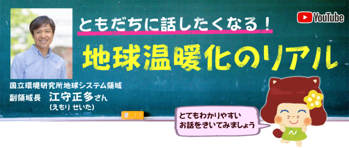 これまでに「エコフェスタにのみや」でもご講演いただきましたが、江守さんが地球温暖化のことについてわかりやすく解説している動画を配信していますので、いつでも、どこでもお話をきくことができます。